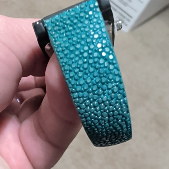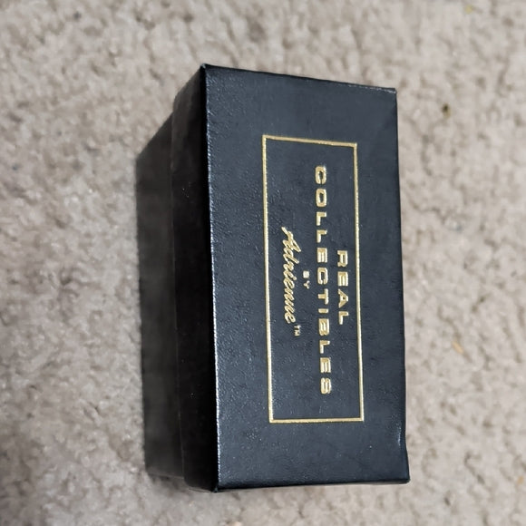 Chic black box featuring elegant gold accents; contains brand new collectible Adrienne leather watch. Never worn, mint condition and in box. Japan Movement.