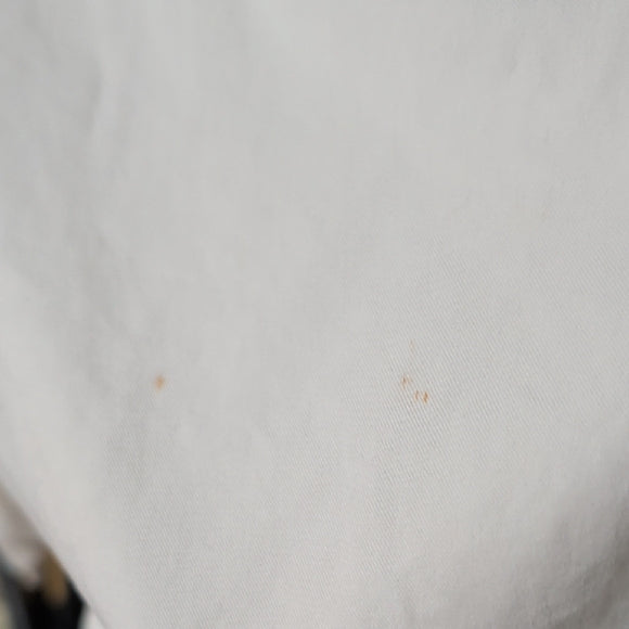 100% cotton, has some tiny spots (pictured) on the front bottom.