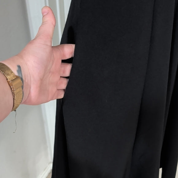 Elegant black midi dress with a flattering fit-and-flare silhouette. V-neckline and mid-length sleeves for a polished look. Smooth, flowing skirt ideal for day or evening wear.