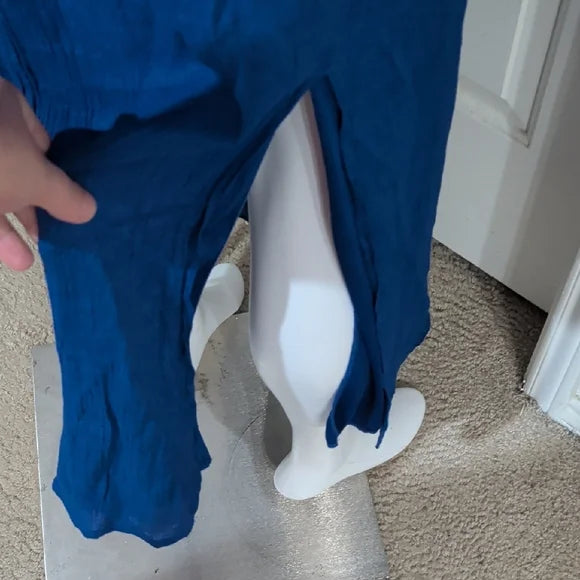 Halter maxi with crochet yoke detail. Drawstring waist for adjustable fit. Flowing skirt with side slits. Lightweight fabric for easy wear.