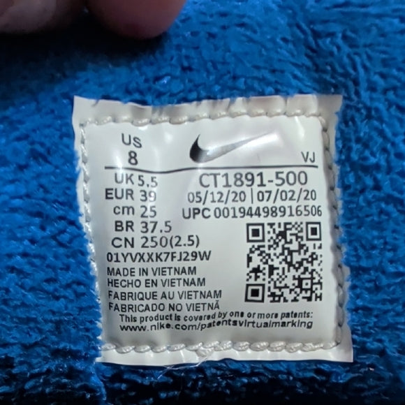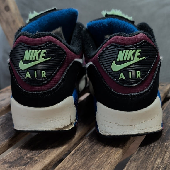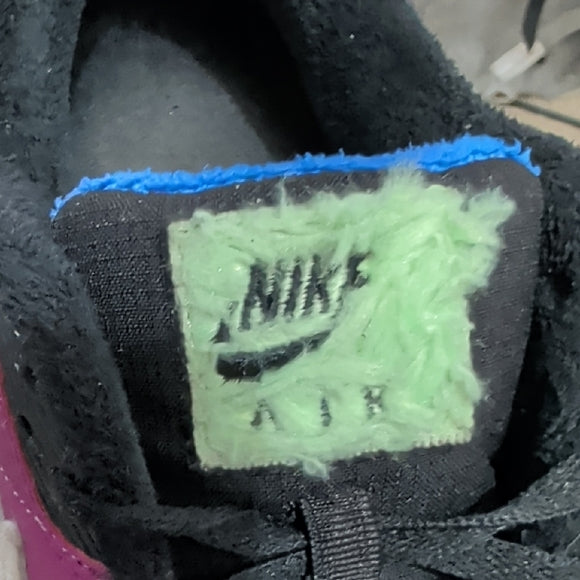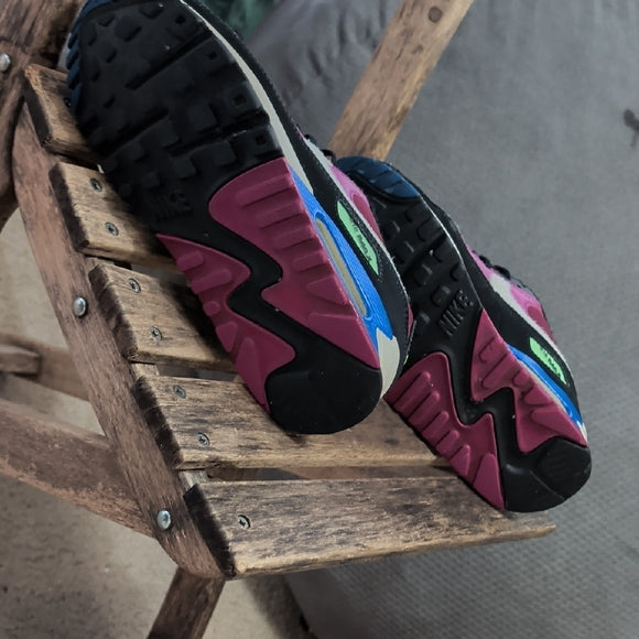 Nike Air Max sneakers with a vibrant multicolor design. Features include a mix of black, blue, pink, and green accents. Some wear and tear, small split in one of the heels, and the fabric on the tongue is a little worn. Very comfy!