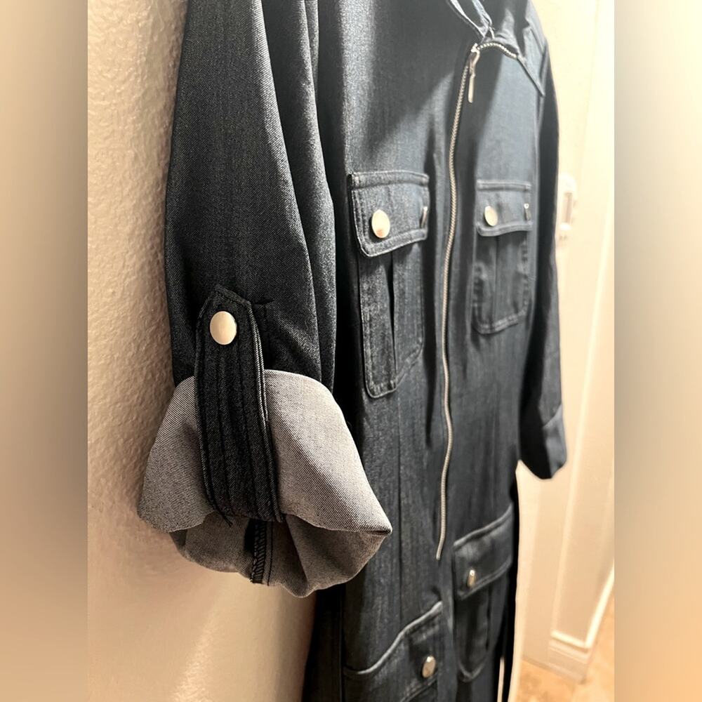 Has a belt and ties at waist. Zipper runs down the front about halfway, and there are four pockets on the front see ode at the chest and hips.