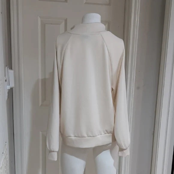 Light cream funnel-neck sweatshirt with an adjustable drawstring for a customizable fit. Soft, cozy fabric with relaxed silhouette for all-day comfort. Ribbed hem and cuffs add subtle structure while keeping a casual look. Versatile cream shade pairs easily with jeans or leggings.