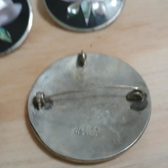 Elegant brooch set featuring black and mother of pearl floral designs. Perfect for adding a touch of sophistication to any outfit. Handmade.