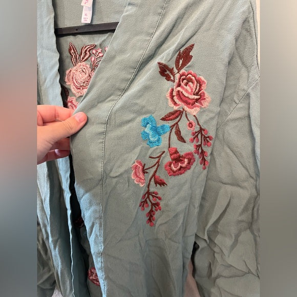 Light sage green belted duster with embroidered floral detail on the chest. Open front with two front pockets. Soft, drapey fabric for easy layering.