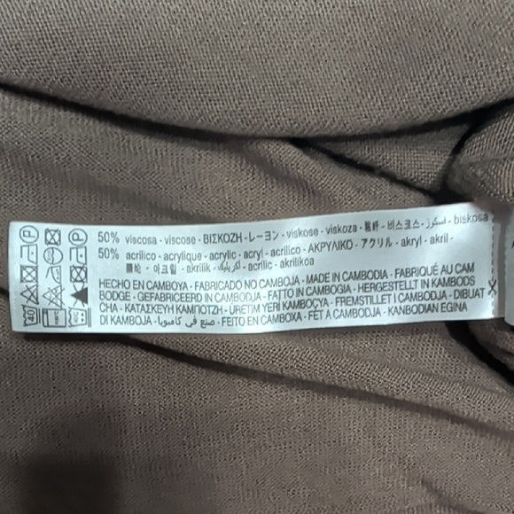 Lightweight crewneck sweatshirt with long sleeves. Soft drapey knit for easy layering. Subtle raw-edge hem adds casual detail. Neutral taupe-brown shade pairs with many looks. Has a spot on the front (pictured) that I haven't tried to remove yet.